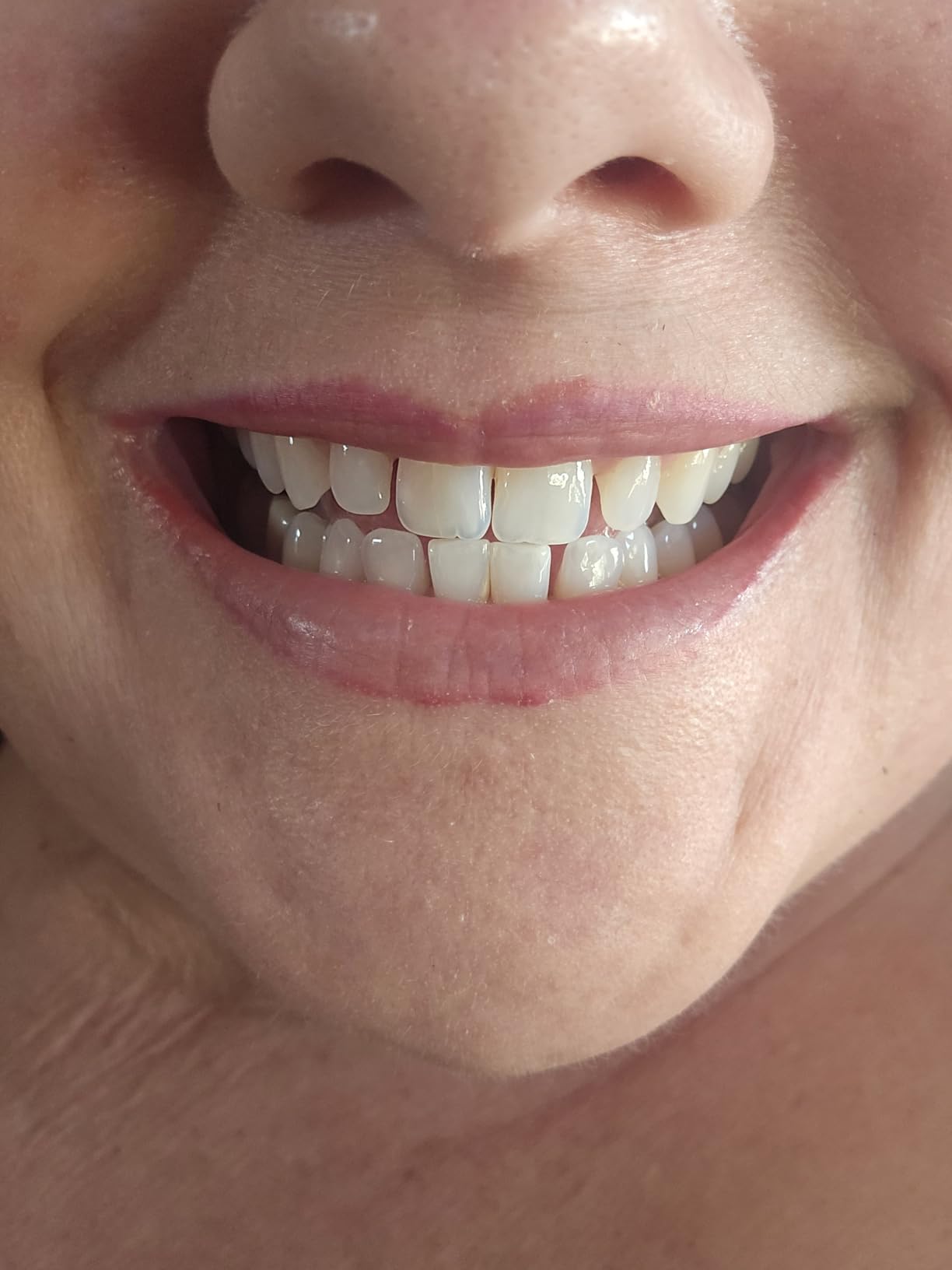 - Teeth look naturally brighter and more balanced, with yellow undertones visibly canceled out.